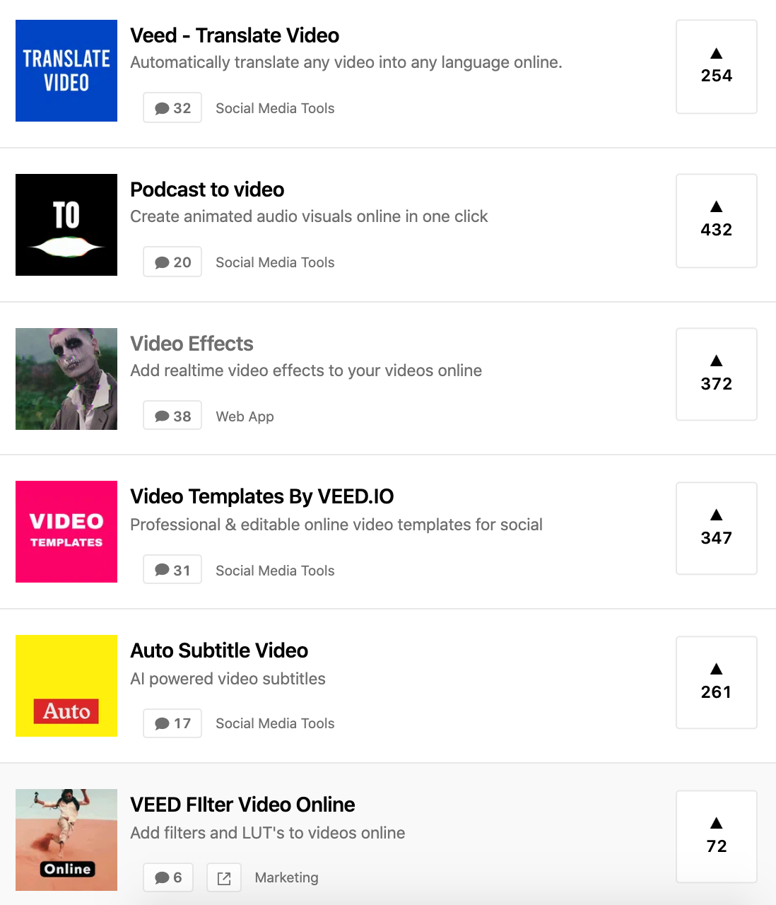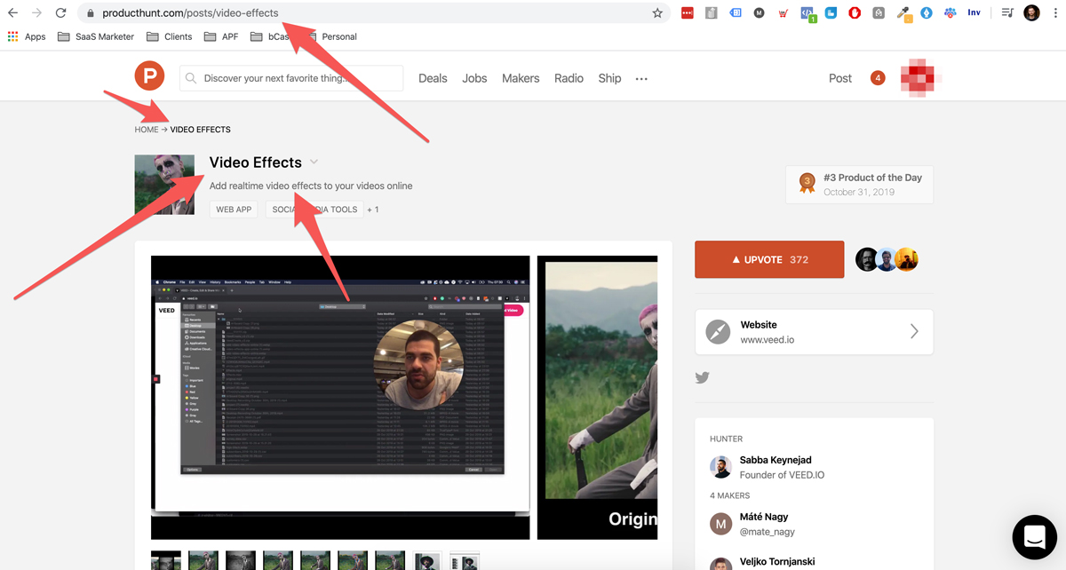 Google also likes to see relatively new pages generate some social and referral traffic early on. So the VEED team launch these landing pages just like new products… on Product Hunt: